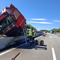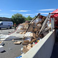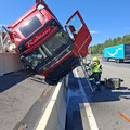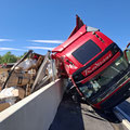Am Einsatzort eingetroffen konnte ein Sattelschlepper, auf der Betonleitwand hängend wahrgenommen werden. Es waren die zweite sowie dritte Fahrspur in beide Richtungen mit Trümmerteilen übersät.